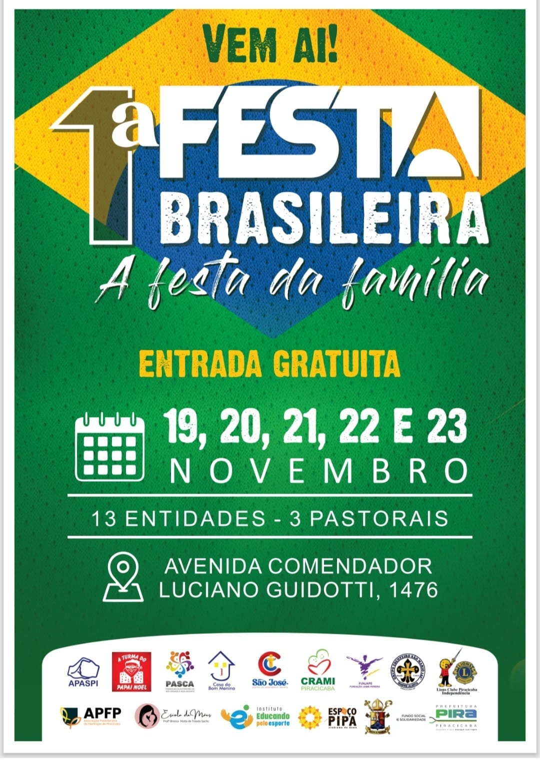 A 1ª Festa Brasileira – A Festa da Família, iniciativa da Diocese de Piracicaba em parceria com a Prefeitura, será realizado entre os dias 19 e 23/11, para apoio direto a 13 entidades e 3 pastorais do município. O evento acontecerá em um espaço cedido pela Diocese, na avenida Luciano Guidotti, 1.476, consolidando uma importante ação comunitária de final de ano.