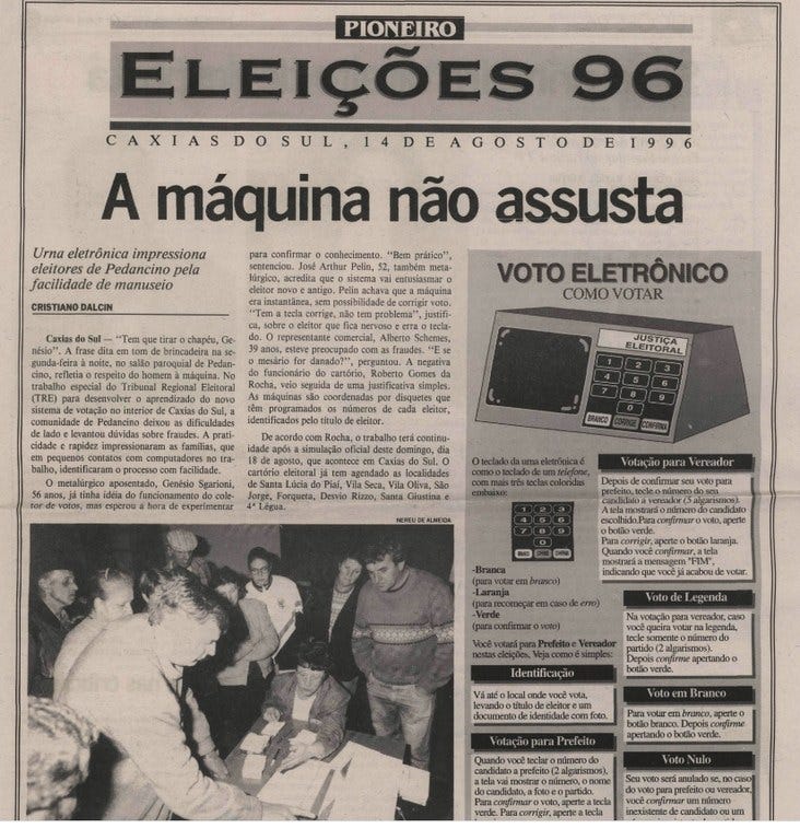 Poucos meses depois, nas eleições municipais daquele mesmo ano, as primeiras urnas eletrônicas estrearam oficialmente no país. Sob a presidência do ministro Marco Aurélio Mello no TSE, o Brasil testemunhou o que foi descrito no artigo“Urna Eletrônica Brasileira – Um Projeto de Sucesso” como uma “festa da cidadania”. Pessoas de todas as idades, incluindo eleitores analfabetos ou semi-alfabetizados, votaram com facilidade, derrubando de vez o pessimismo dos que duvidavam da capacidade popular de lidar com o computador.