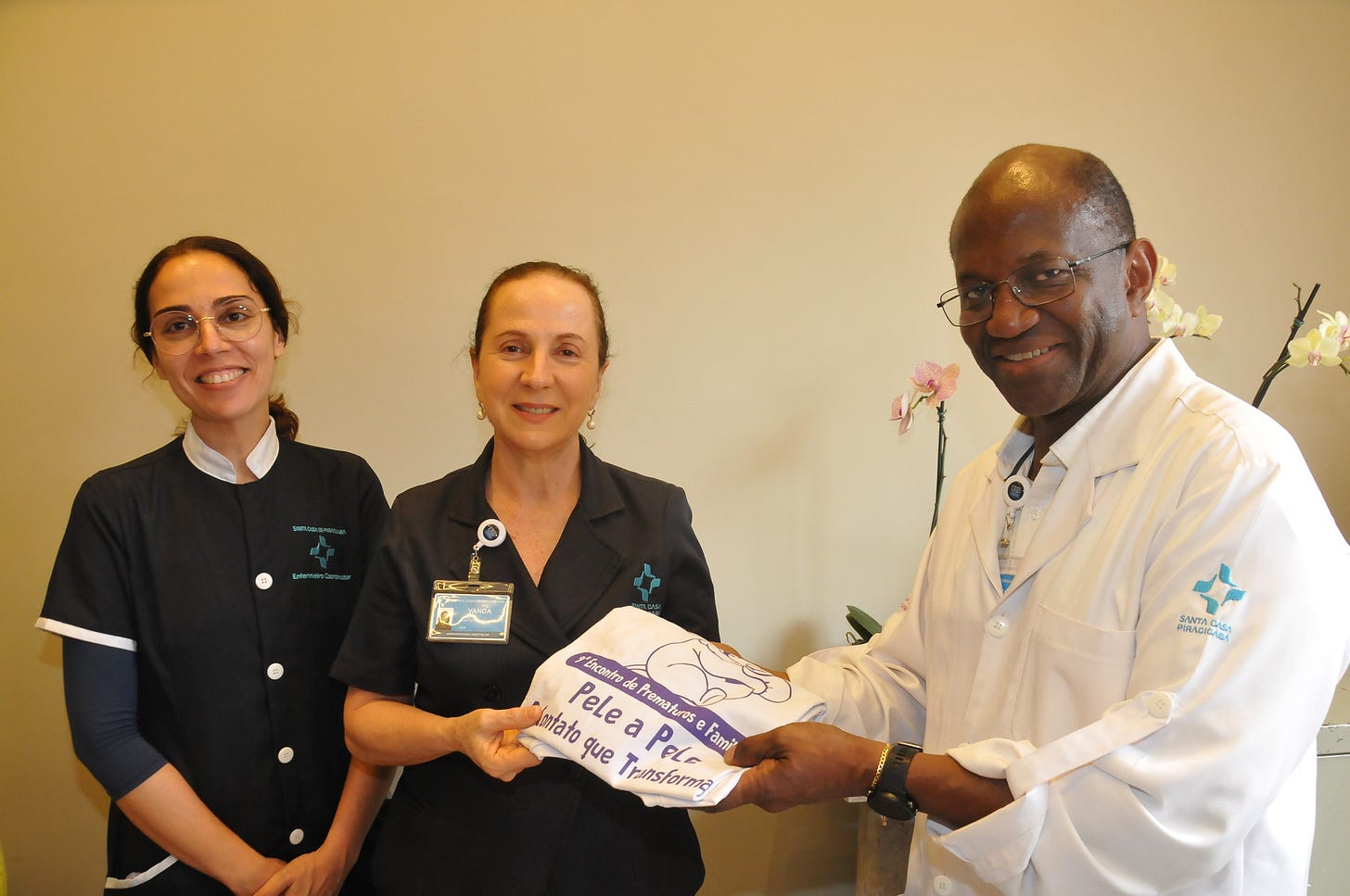 Em preparação ao encontro, o médico coordenador da UTI Neonatal, Antônio Ananias Filho, e a enfermeira coordenadora da Unidade, Maiby Marocco Parazzi, entregaram a camiseta oficial do evento à administradora da Santa Casa, Vanda Petean, simbolizando o engajamento institucional na realização do evento, que tem a coordenação geral de Margarete Ananias.