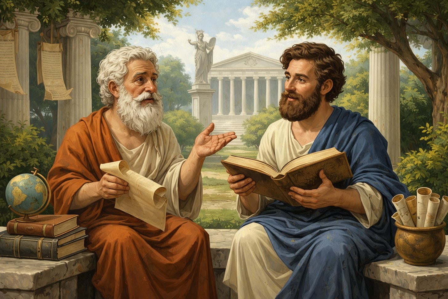 O que era para ser complementar e amigáveis, Platão e Aristóteles tornam-se rivais para muitos das novas gerações de filósofos. Na academia tem muito aluno de filosofia que não lê mais Platão nem Aristóteles. Consideram que eles estão mortos e não são mais base para coisa alguma. Essa postura horrenda gera um vazio assustador no campo da teoria e muita distorção. Há ainda a galera que tenta adaptar tais pensamentos para o mundo moderno e sem filtros. Fazem muito barulho com reflexões fora do foco.