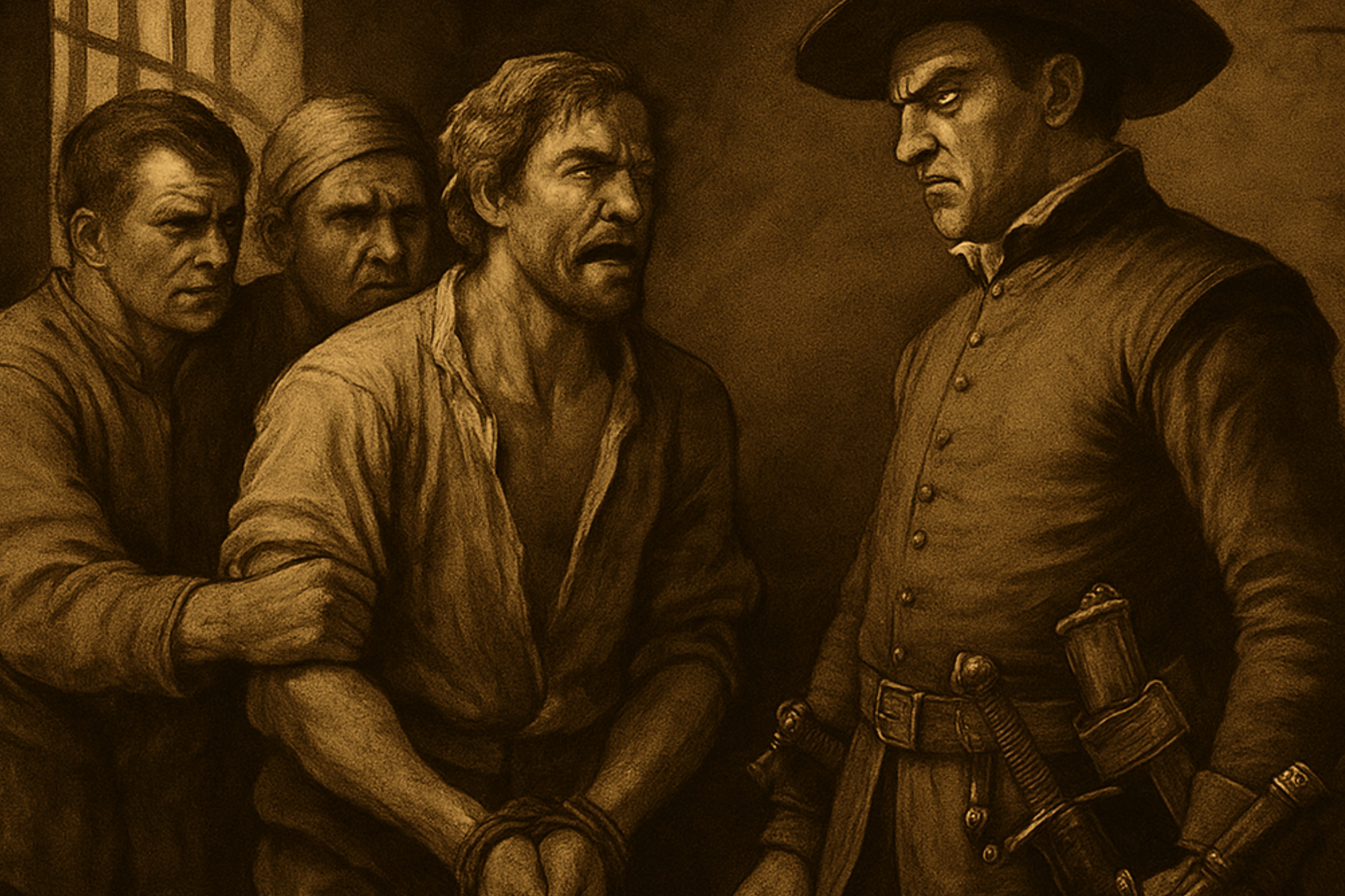 A resposta a estas representações, que os executores levaram ao dito Alferes, foi a vinda deste com uma espada nua na mão, e com uma pistola junto ao peito, e aí sem atender a representação alguma, compeliu um par de [satélites] seus ali presentes a porem uma corrente ao pescoço do suplicante e a meterem o de tronco de pé em cuja situação conservou-se o suplicante desde então, que já era noite até o dia seguinte, pelo meio dia. Foi então que o Capitão Mor, que tinha ouvido a noticia (...) mandou por o suplicante em liberdade.