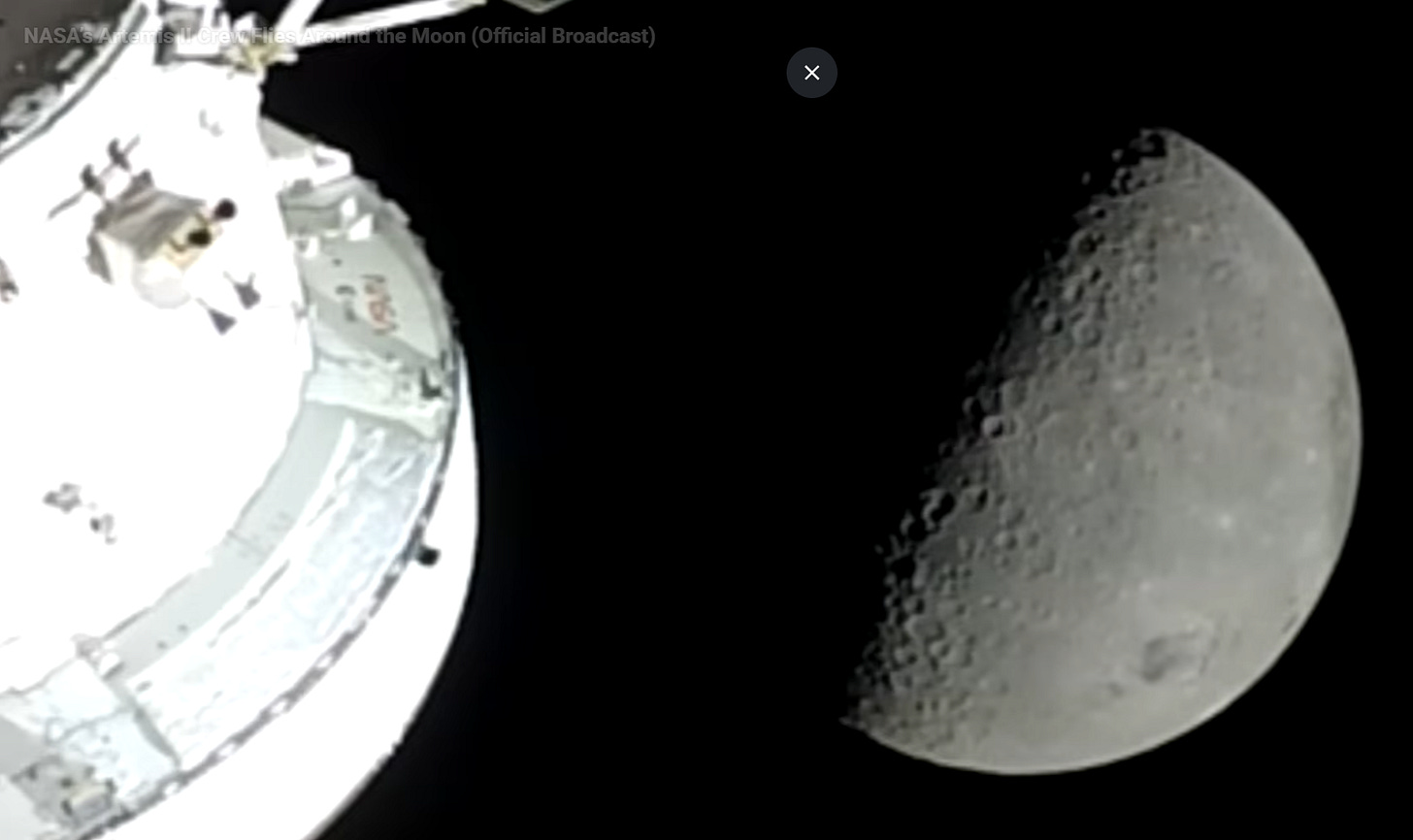 Às 14h45, iniciou-se o período de sobrevoo, quando a nave irá chegar mais próxima da Lua - a altitude mínima será de 6.400 km da superfície lunar. As observações, fotografias e videos, realizados pela equipe de quatro astronautas - Red Wiseman (comandante), Christina Koch (especialista de missão), Victor Glover (piloto) e Jeremy Hansen (especialista de missão) - são transmitidas ao Controle de Missão, em Houston, EUA, e quase que imediatamente exibidas na transmissão ao vivo no canal da Nasa no YouTube.