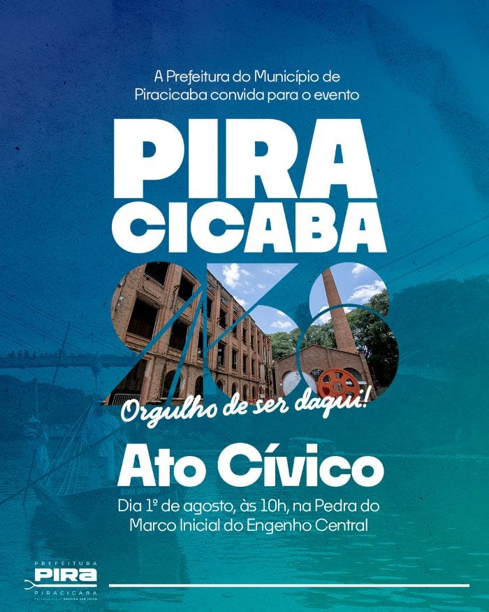 A programação especial que celebra os 258 anos de Piracicaba tem início amanhã, 1º de agosto, às 10 horas, com o Ato Cívico na Pedra do Marco Inicial, no Engenho Central, próximo ao Galpão 14C.