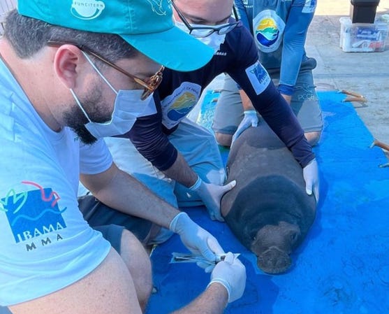 Coleta de amostra de peixe-boi para testagem de patógenos bacterianos de prioridade crítica da OMS resistentes aos antibióticos, no Rio Grande do Norte (foto: Augusto Carlos da Bôaviagem Freire/Projeto Cetáceos da Costa Branca-UERN)