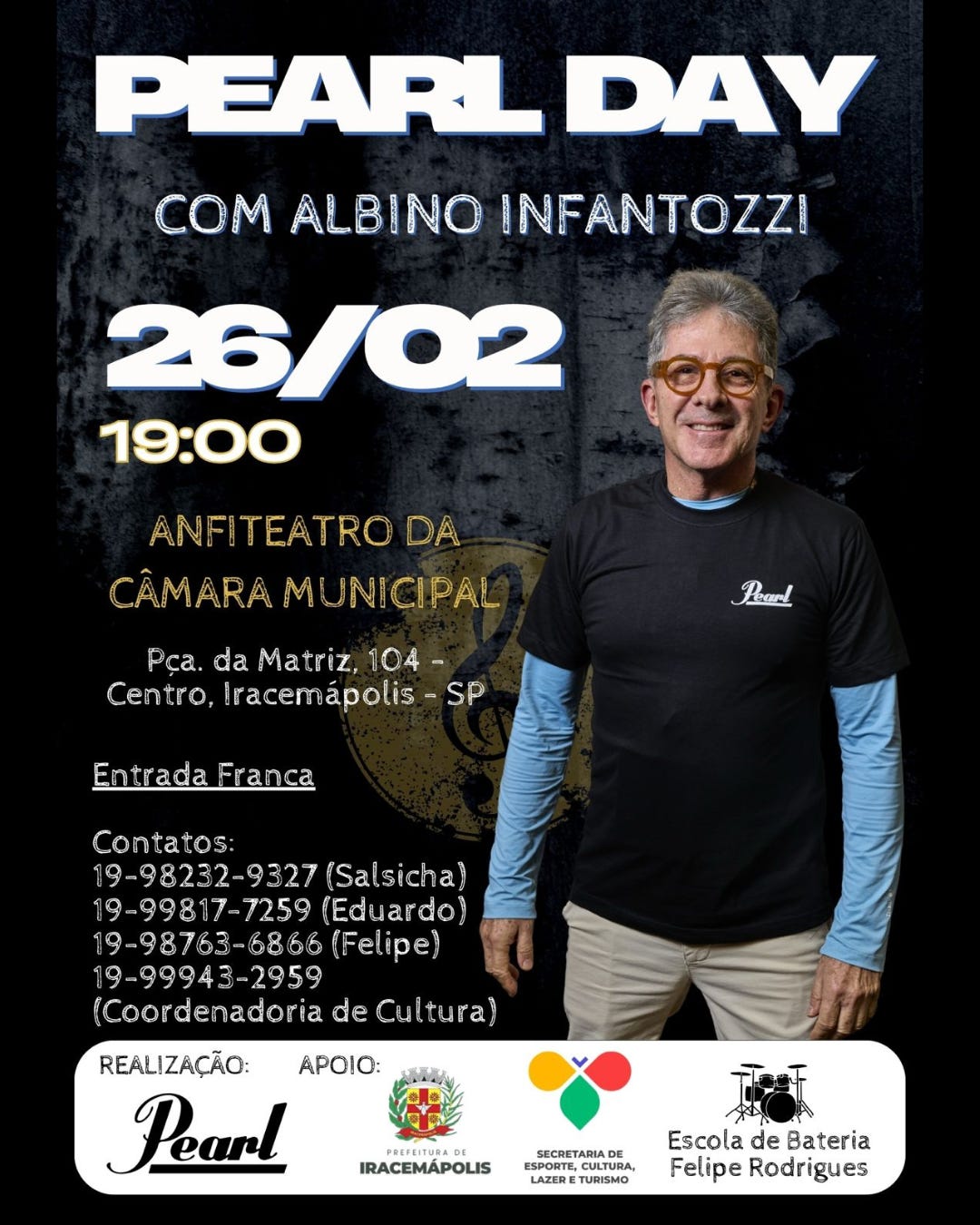 O evento acontecerá no anfiteatro da Câmara Municipal, localizado na Praça da Matriz, 104, Centro. Mais informações podem ser obtidas pelos telefones (19) 98232-9327 (Salsicha), (19) 99817-7259 (Eduardo), (19) 98763-6866 (Felipe) e (19) 99943-2959 (Coordenadoria de Cultura). A realização é da Pearl, com apoio da Prefeitura de Iracemápolis, Secretaria de Esporte, Cultura, Lazer e Turismo e Escola de Bateria Felipe Rodrigues.