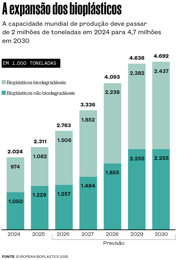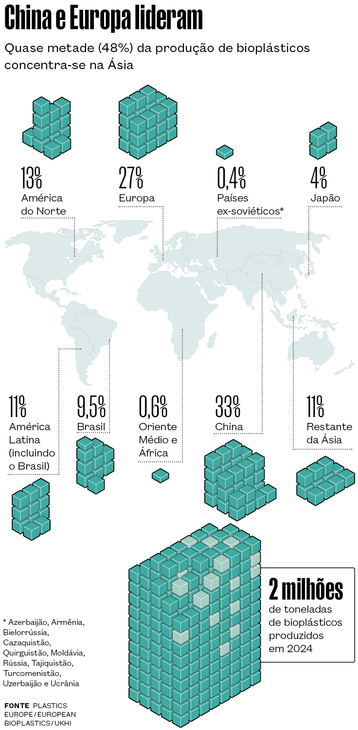 Os bioplásticos – que podem ser ou não biodegradáveis – respondem por 0,5% da produção global de plásticos, o equivalente a 2 milhões de toneladas (t) em 2023, mas estão se expandindo com rapidez, de acordo com a European Bioplastics, associação que reúne as indústrias do setor no continente. O Brasil é o terceiro maior produtor mundial de bioplásticos, atrás da China e dos Estados Unidos (ver infográfico acima). A produção nacional foi de cerca de 200 mil t em 2019, o equivalente a 9,5% do total mundial, de acordo com o levantamento mais recente da empresa indiana UKHI, publicado em novembro de 2025.