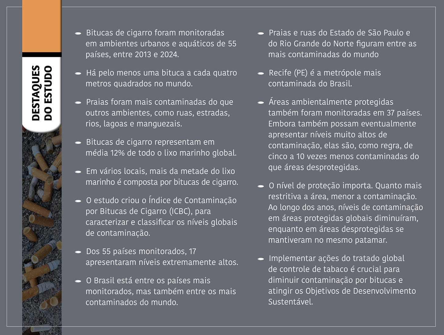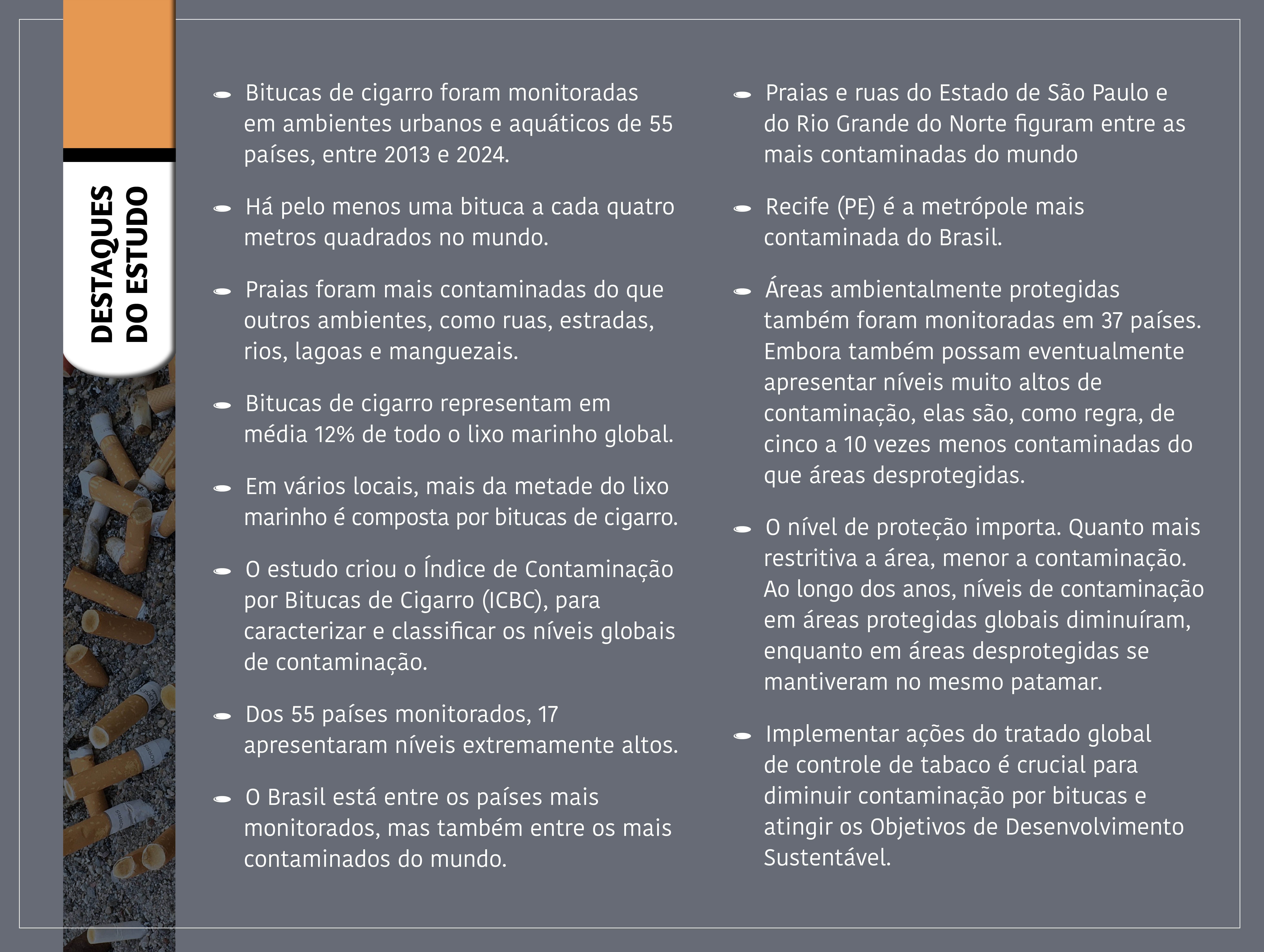 O artigo Global cigarette butt contamination: a review pode ser acessado em: link.springer.com/article/10.1007/s10311-026-01897-0.