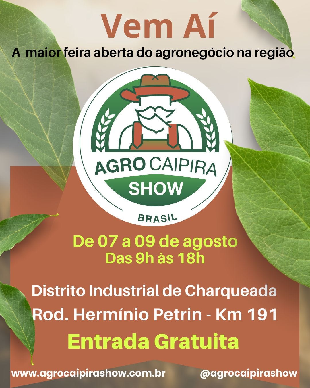 FEIRA DO AGRONEGÓCIO AGROCAIPIRASHOW 2025 - Dias 07, 08 e 09 de agosto, das 9h às 18h, às margens da Rodovia Hermínio Petrin (SP-308), Km 191 – Distrito Industrial de Charqueada. Entrada gratuita (credenciamento antecipado pelo site www.agrocaipirashow.com.br). Pede-se a doação de um litro de leite de caixinha, a ser destinado às entidades atendidas pelo Fundo de Assistência Social de Charqueada. Informações: (19) 99608-5707.