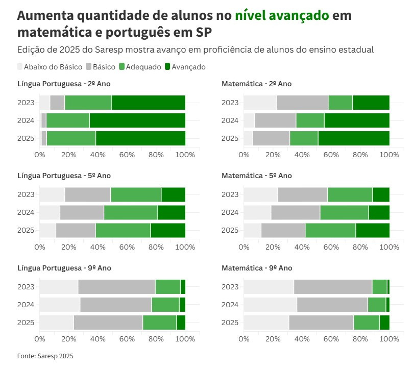 Com mais aulas de língua portuguesa, incluindo os componentes de redação e leitura e orientação de estudos, houve também um aumento da quantidade de alunos que alcançaram os maiores níveis – avançado e adequado. Em 2025, são 24,7% dos estudantes contra 11,9% na edição de 2023.