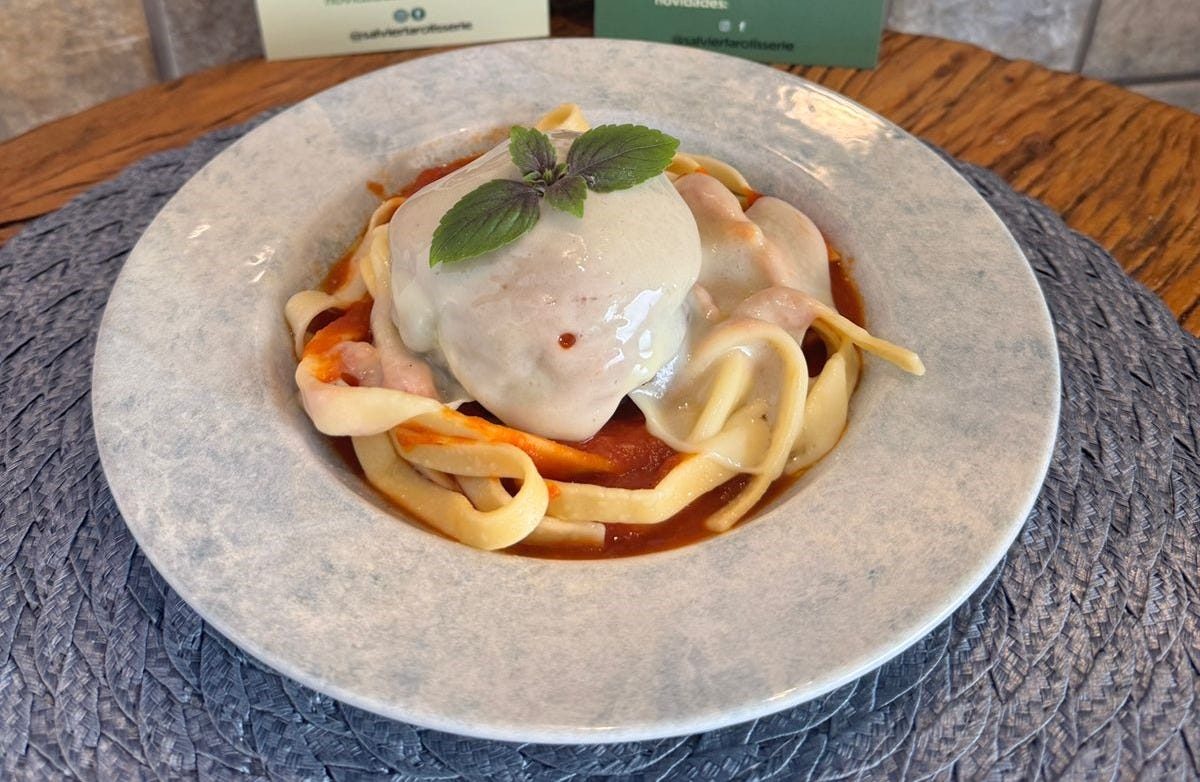 Talharim com molho ao sugo e polpetone, da Cantina Salvierta