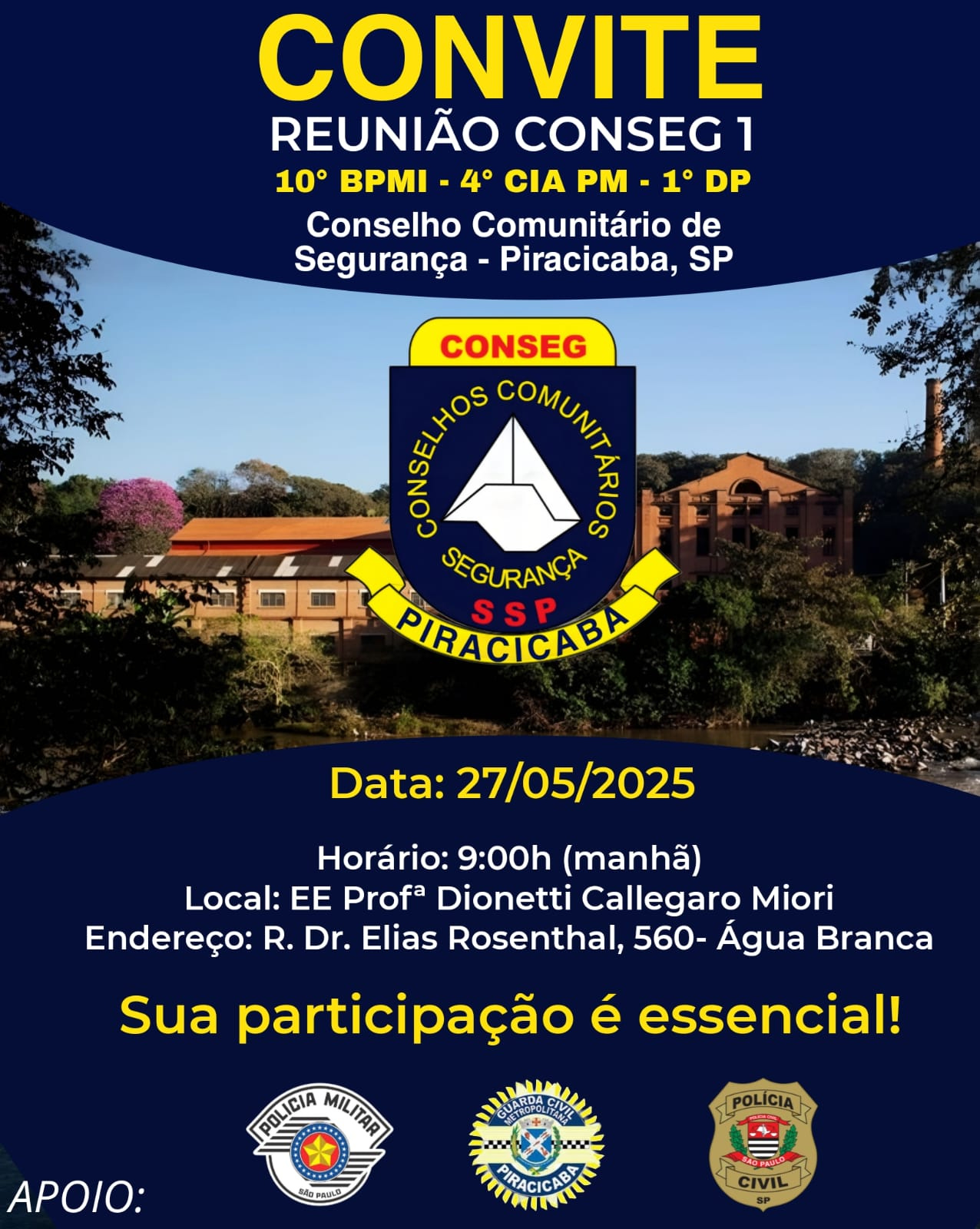 O Conselho Comunitário de Segurança 1 – 4ª Companhia/ 1º DP – (Conseg) realiza amanhã (27) sua reunião mensal, quando será dada posse à nova diretoria, eleita para o biênio 2025/2027.