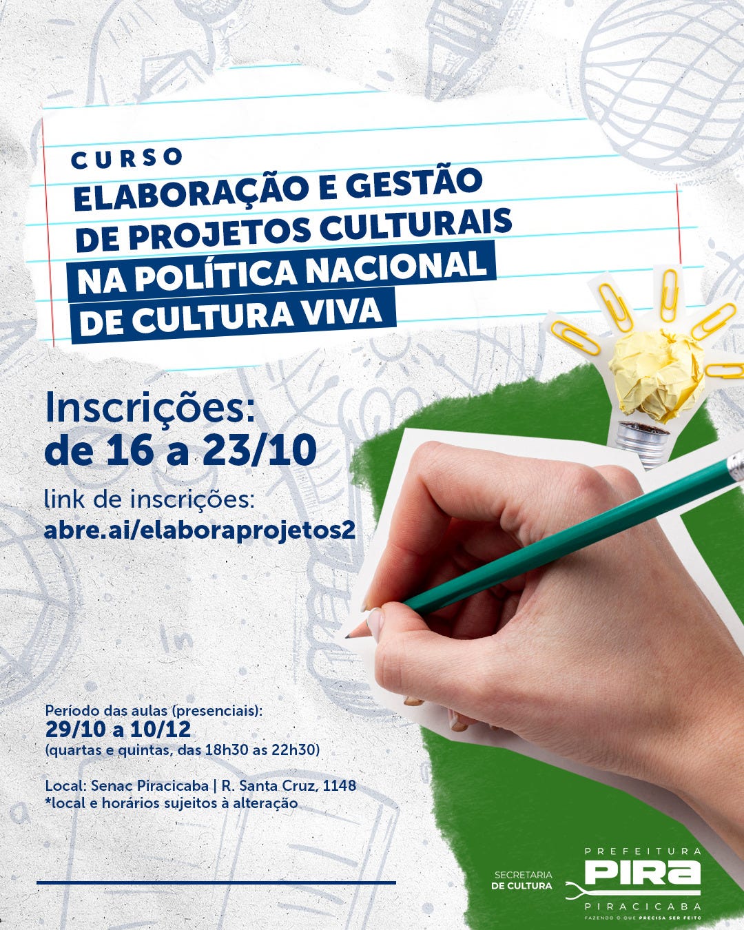 A Secretaria Municipal de Cultura está com inscrições abertas para o curso gratuito Elaboração de Projetos para o Cultura Viva, política pública do Governo Federal, que tem certificação do Senac. As inscrições podem ser feitas até 23 de outubro, pelo link abre.ai/elaboraprojetos2