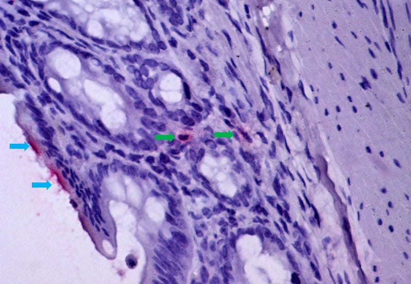 Mucosa intestinal de hamster infectado pelo vírus da febre amarela, demonstrando isquemia e translocação bacteriana, mecanismo de passagem de bactérias e seus produtos (marcados em vermelho, por imunohistoquímica) do lúmen intestinal (setas azuis) para a mucosa intestinal (setas verdes), atingindo a corrente sanguínea. O mesmo mecanismo de lesão ocorre em humanos com febre amarela fatal (imagem: Amaro Nunes Duarte Neto/HC-FM-USP)