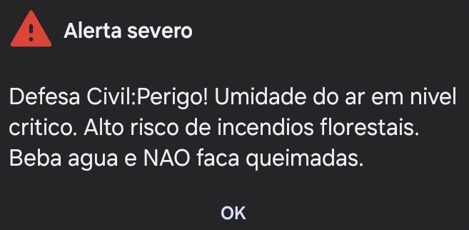 A tecnologia integra a Operação SP Sem Fogo, que reúne esforços estaduais e municipais na prevenção e combate às queimadas durante o período de estiagem. O texto do alerta severo informa: “Perigo! Umidade do ar em nível crítico. Alto risco de incêndios florestais. Beba água e NÃO faça queimadas”.