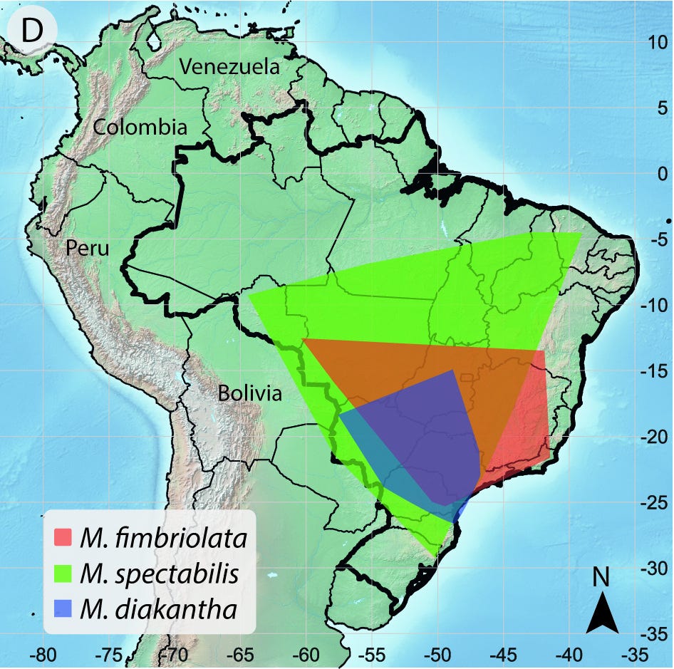 Mapa de distribuição das três espécies e área de intersecção entre elas (figura: Andressa Paladini/UFPR)