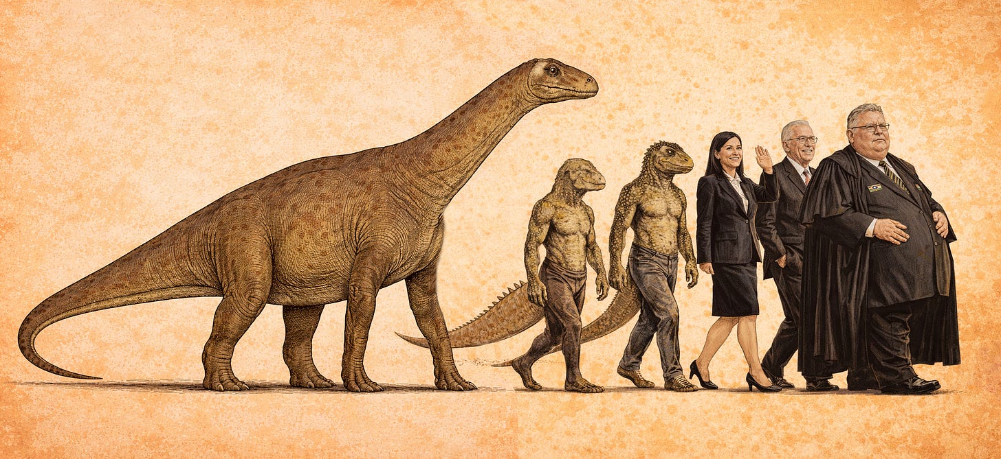 Só para citar algo da fonte científica: “Nomeado Dasosaurus tocantinensis, o animal [primitivo] tinha aproximadamente 20 metros e viveu há cerca de 120 milhões de anos”. Agora podemos dizer que um ciclo de 120 milhões de anos se fecha, sem que nenhum dinossauro seja vítima da Polícia Federal. Experiência, poder e longevidade.