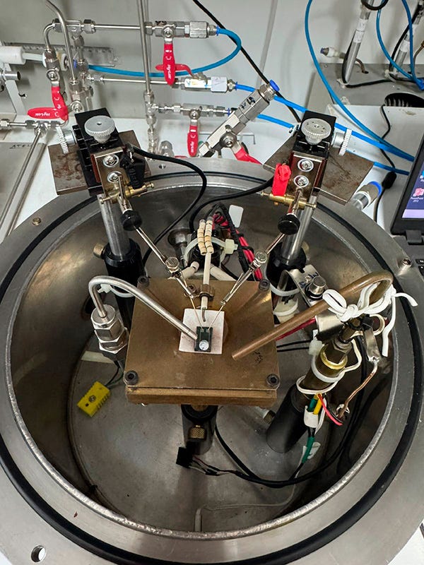 Os testes dos sensores foram realizados em uma câmara de gás, mensurando a resistência elétrica ao longo de todo o experimento. Dentro da câmara de gás, o sensor é exposto a um fluxo de ar sintético para a adsorção de íons de oxigênio na superfície do sensor, que interagem com as moléculas do gás tóxico. Nesse processo, os íons do oxigênio aderem ao exterior do sensor, e se fixam apenas em sua interface.