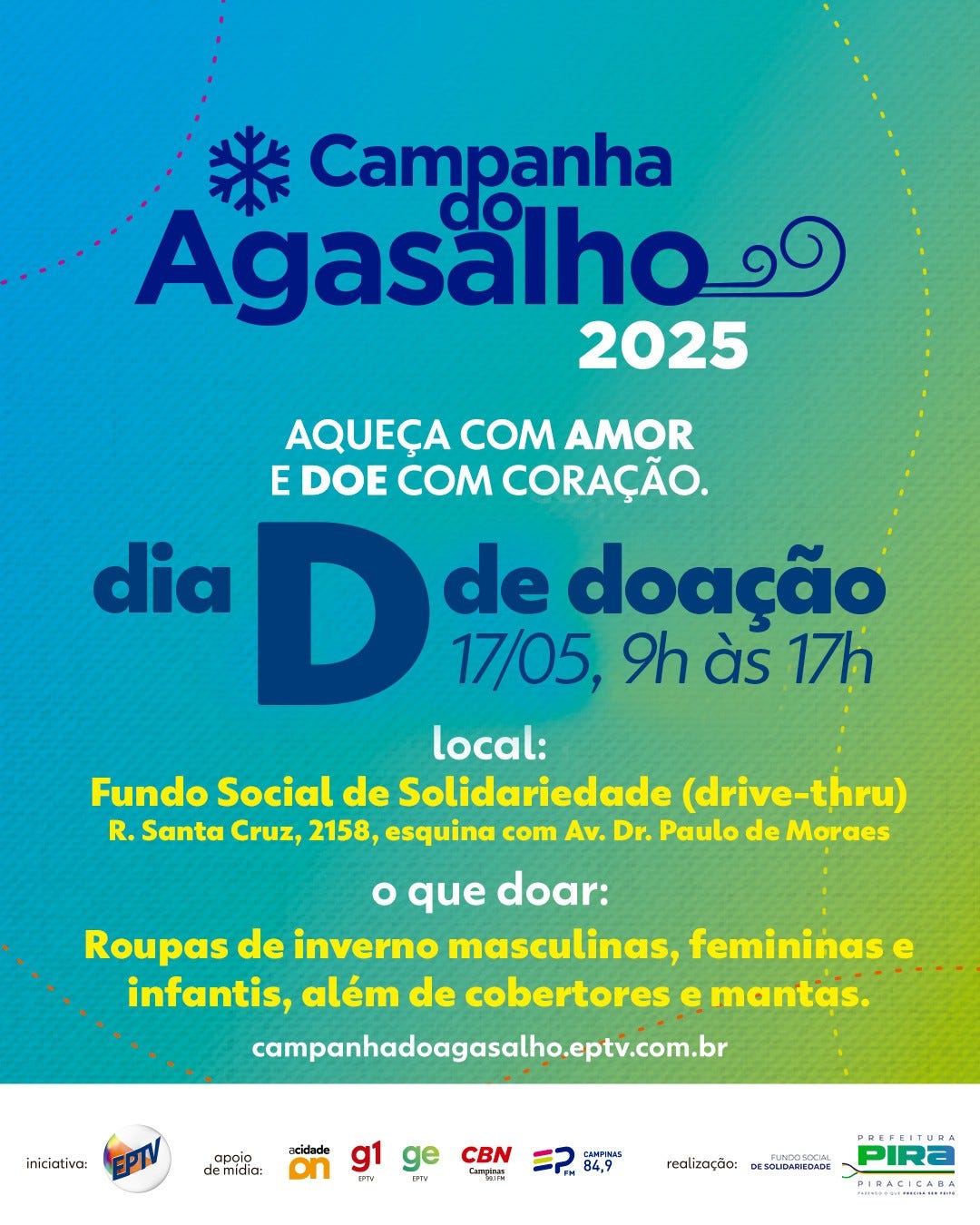 O Fundo Social de Solidariedade de Piracicaba realiza o Dia D da Campanha do Agasalho 2025 amanhã (17), das 9h às 17 horas, com doações recebidas pelo sistema drive thru, na sede do Fundo, sendo a entrada pela rua Santa Cruz, 2158, esquina com a avenida Dr. Paulo de Moraes.