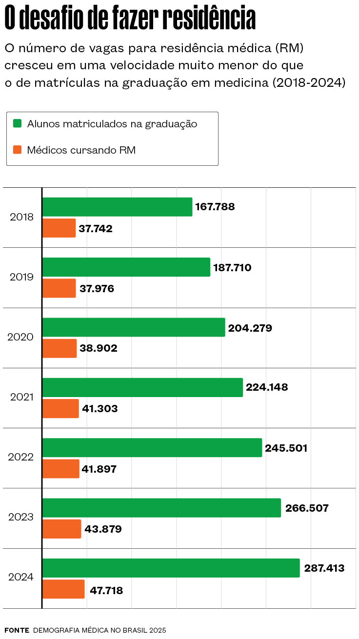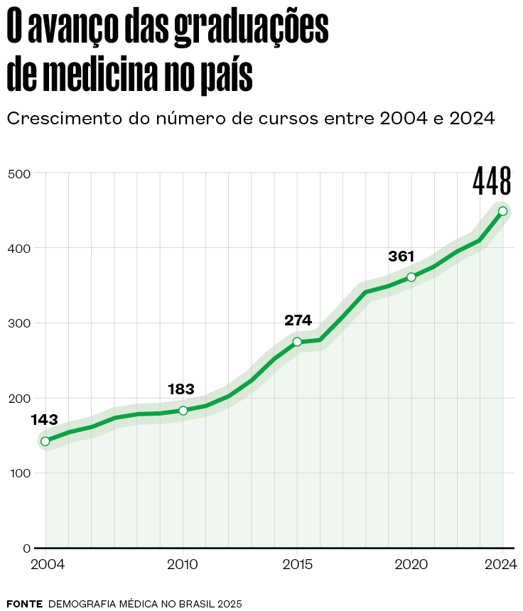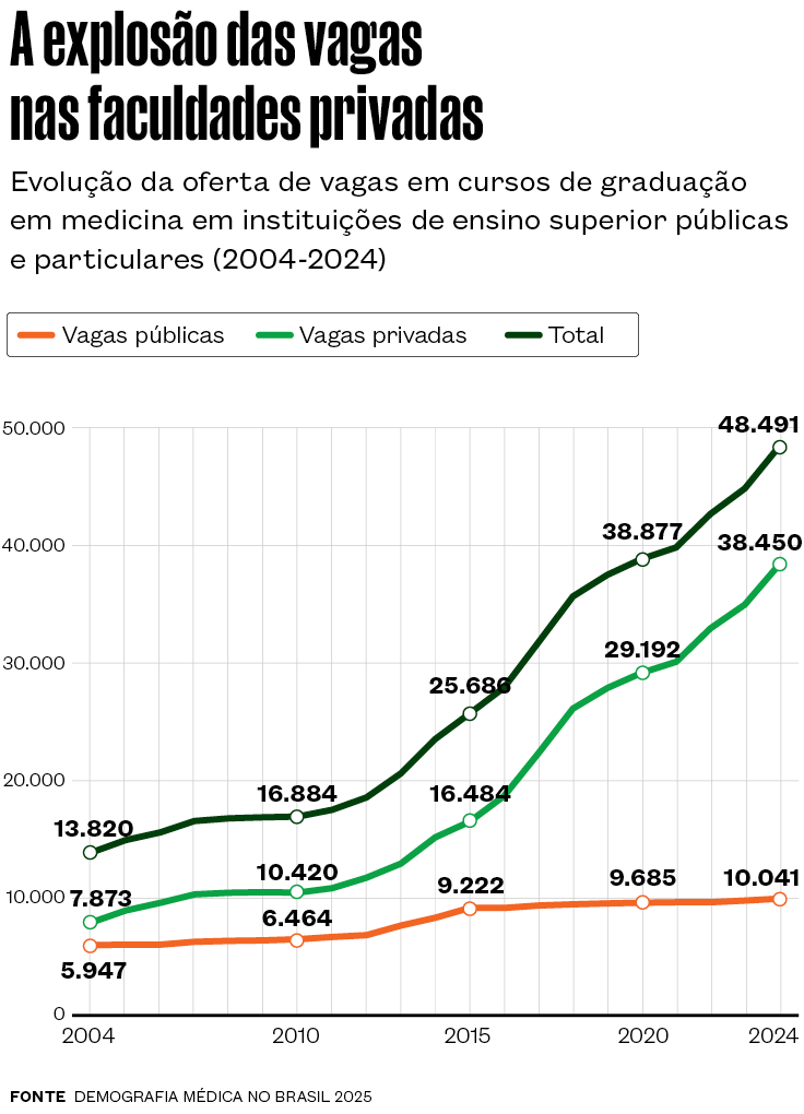 O resultado é que o número de cursos de medicina seguiu crescendo de forma acelerada e saltou para 448 em 2024. “Faculdades que já existiam também conseguiram liminares para ampliar suas vagas, em um cenário sem qualquer regulação”, explica Sandro Schreiber de Oliveira, epidemiologista da Universidade Federal do Rio Grande (Furg) e diretor-presidente da Associação Brasileira de Educação Médica (Abem). Esse movimento fez com que o número de vagas em faculdades de medicina mais que dobrasse no Brasil, de 23,5 mil vagas em 2014 para 48,5 mil em 2024 – dessas, 79% estão em instituições privadas.