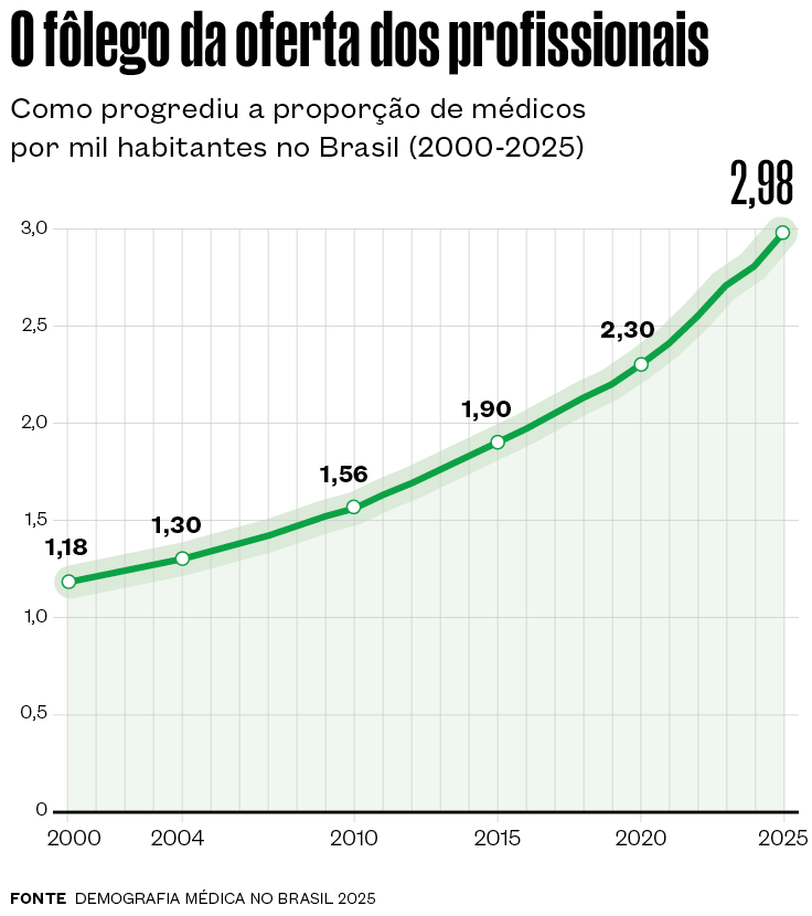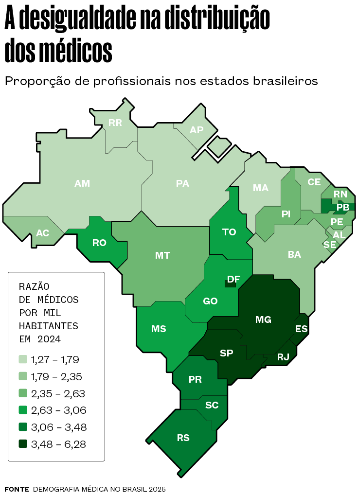 A expansão recente criou desafios novos, sem que velhos problemas tenham sido resolvidos, a exemplo da distribuição desigual dos profissionais no território brasileiro. De acordo com o estudo Demografia Médica no Brasil 2025, coordenado pela Faculdade de Medicina da Universidade de São Paulo (FM-USP), Associação Médica Brasileira e pelo Ministério da Saúde, 68% dos médicos se concentram em 48 cidades que, embora tenham mais de meio milhão de habitantes, reúnem só 30% da população do país. Os municípios mais aquinhoados são Vitória (ES), com 18,52 médicos por mil habitantes, Porto Alegre (RS), com 11,81, e Florianópolis (SC), com 10,48. O exemplo mais precário é o da região oeste do Amazonas, que abrange 21 municípios no Alto Juruá e Alto Solimões. Há, ali, 0,21 médico para mil habitantes.