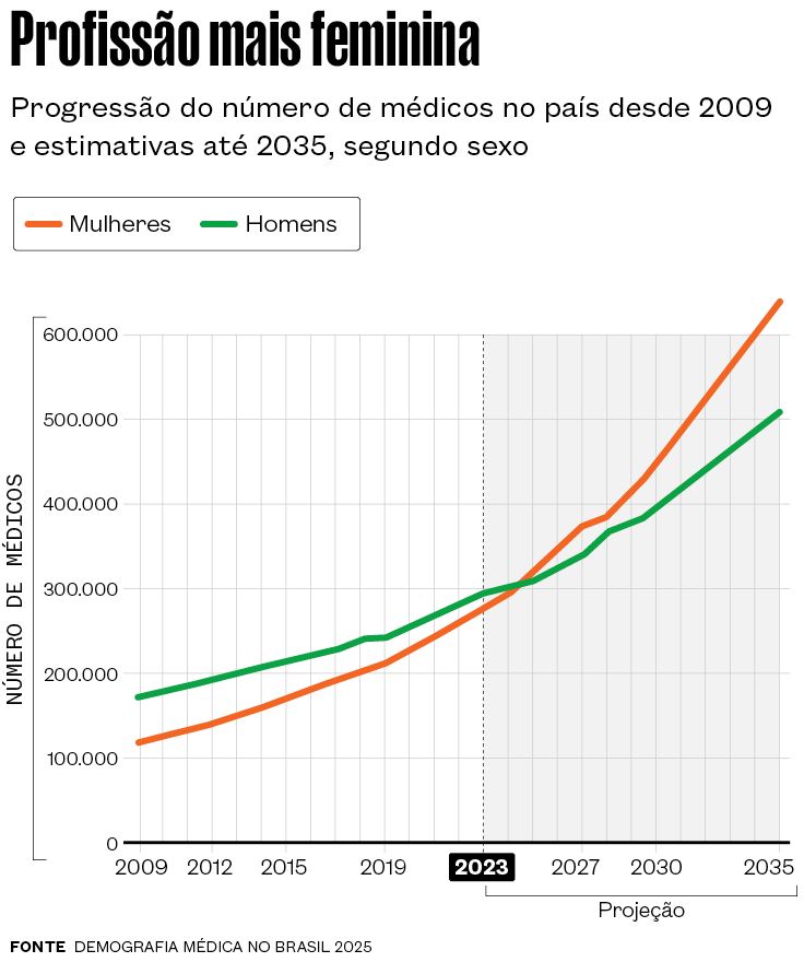 Outra tendência apontada pelo estudo é a da feminilização da profissão. As mulheres devem se tornar maioria entre os médicos brasileiros neste ano e, mantidas as condições atuais, devem chegar a 60% em 10 anos – em São Paulo, serão dois terços dos profissionais em atividade. Scheffer observa que o Brasil vive uma situação nova, com uma oferta expressiva de médicos, e precisa criar políticas públicas para que toda a sociedade se beneficie do trabalho desses profissionais. “Uma população de médicos mais jovem e feminina e indicadores de demografia que irão superar os de nações de maior renda é o que se desenha para o Brasil na próxima década.”