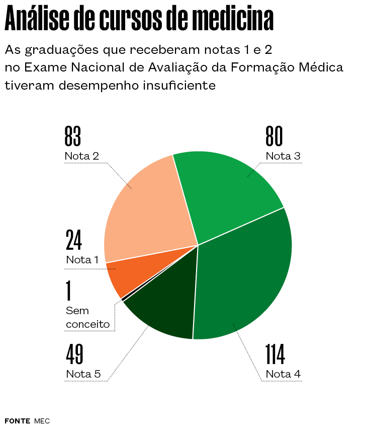 O cancelamento do edital foi uma espécie de freio de arrumação depois do alarme causado pela divulgação dos resultados do Exame Nacional de Avaliação da Formação Médica (Enamed), prova anual criada pelo ministério para examinar a qualidade da formação oferecida pelos cursos – o teste foi aplicado pela primeira vez a alunos de medicina de último ano para verificar o conhecimento adquirido. Dos 39.258 formados em 351 cursos que participaram da Enamed, apenas 67% alcançaram proficiência. Trinta por cento das graduações receberam conceitos 1 (até 39,9% de estudantes proficientes) e 2 (entre 40% e 59,9% de alunos proficientes), performance considerada insuficiente. Faculdades municipais, que tiveram só 944 alunos avaliados, foram as com pior desempenho: apenas 49,7% proficientes. Já as escolas privadas com fins lucrativos se destacaram pelo volume de reprovações: 57,2% de 15.409 estudantes tiraram conceitos 1 e 2. Universidades federais e estaduais registraram índices superiores a 80% de proficiência.