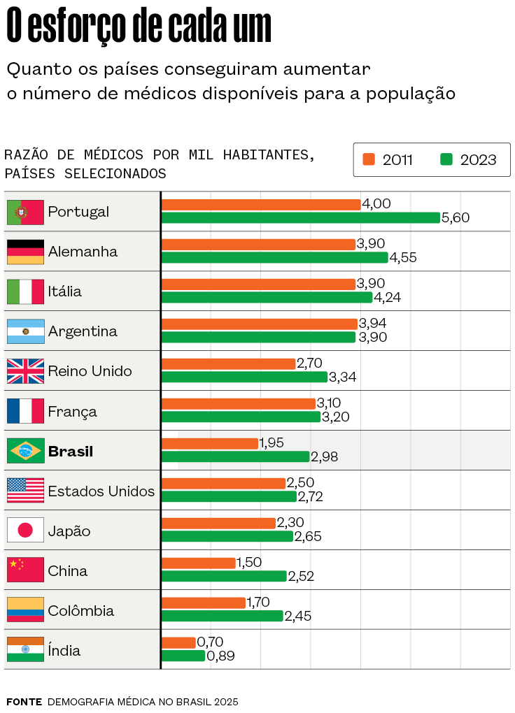 Uma dúvida é se o país chegará ao ponto de ter profissionais em excesso, como temem as entidades médicas. “Não há parâmetros objetivos para responder a essa pergunta, mas eu arriscaria dizer que o Brasil vai necessitar proporcionalmente de mais profissionais do que os outros países”, afirma Schreiber, da Abem. “Nenhum outro país com as dimensões do Brasil oferece cobertura universal de saúde a toda a sua população e o sistema público se conjuga com um sistema privado com demandas próprias. Precisamos de médicos para abastecer simultaneamente esses dois sistemas.”