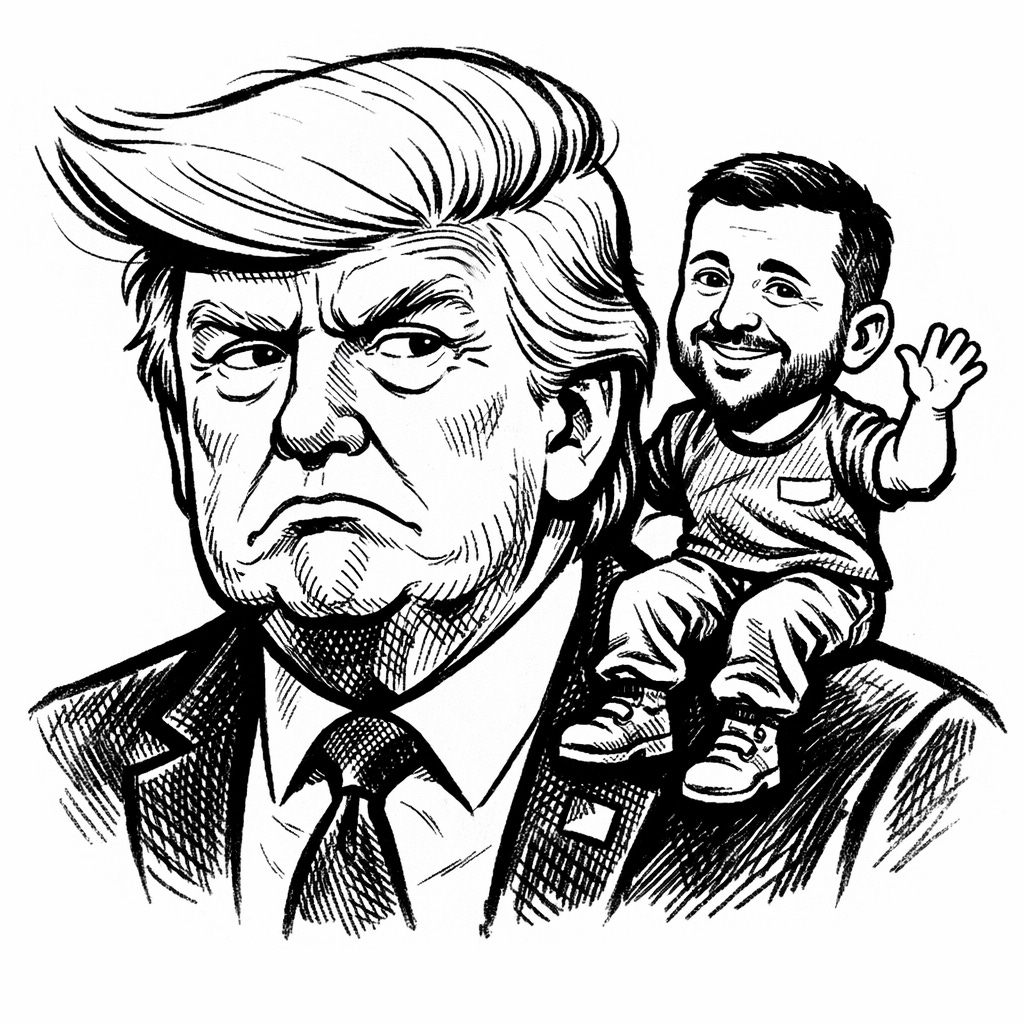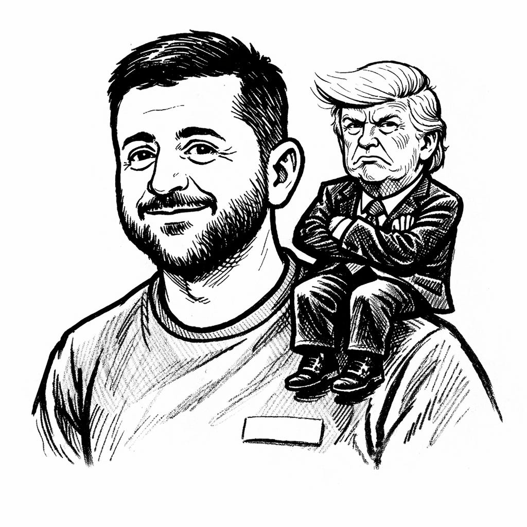 Trump bate nas costas de Zelensky e diz: “Corre, garoto, senão Putin te pega”. O presidente da Ucrânia, por sua vez, tenta se explicar, diplomaticamente: “Mas, presidente, é exatamente por causa de Putin que estamos aqui. Precisamos da sua ajuda para vencê-lo”.