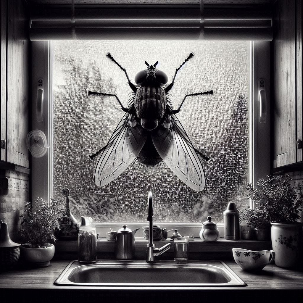 Diante da janela da cozinha, eu observava uma grande mosca se batendo na vidraça, pelo lado de dentro da casa. Ela não conseguia ir embora, subia, descia, se metia em algum canto dos trilhos, mas não encontrava saída. Eu havia retirado o protetor de tela da abertura, que permite alguns vãos para fuga de insetos ao quintal, e fechei tudo, devido ao frio. Mas a porta estava semiaberta e havia outros locais da casa onde ela poderia se esconder e escapar do meu olhar. No entanto, a mosca insistia em se bater contra a vidraça e fazia ali sua performance para mim.
