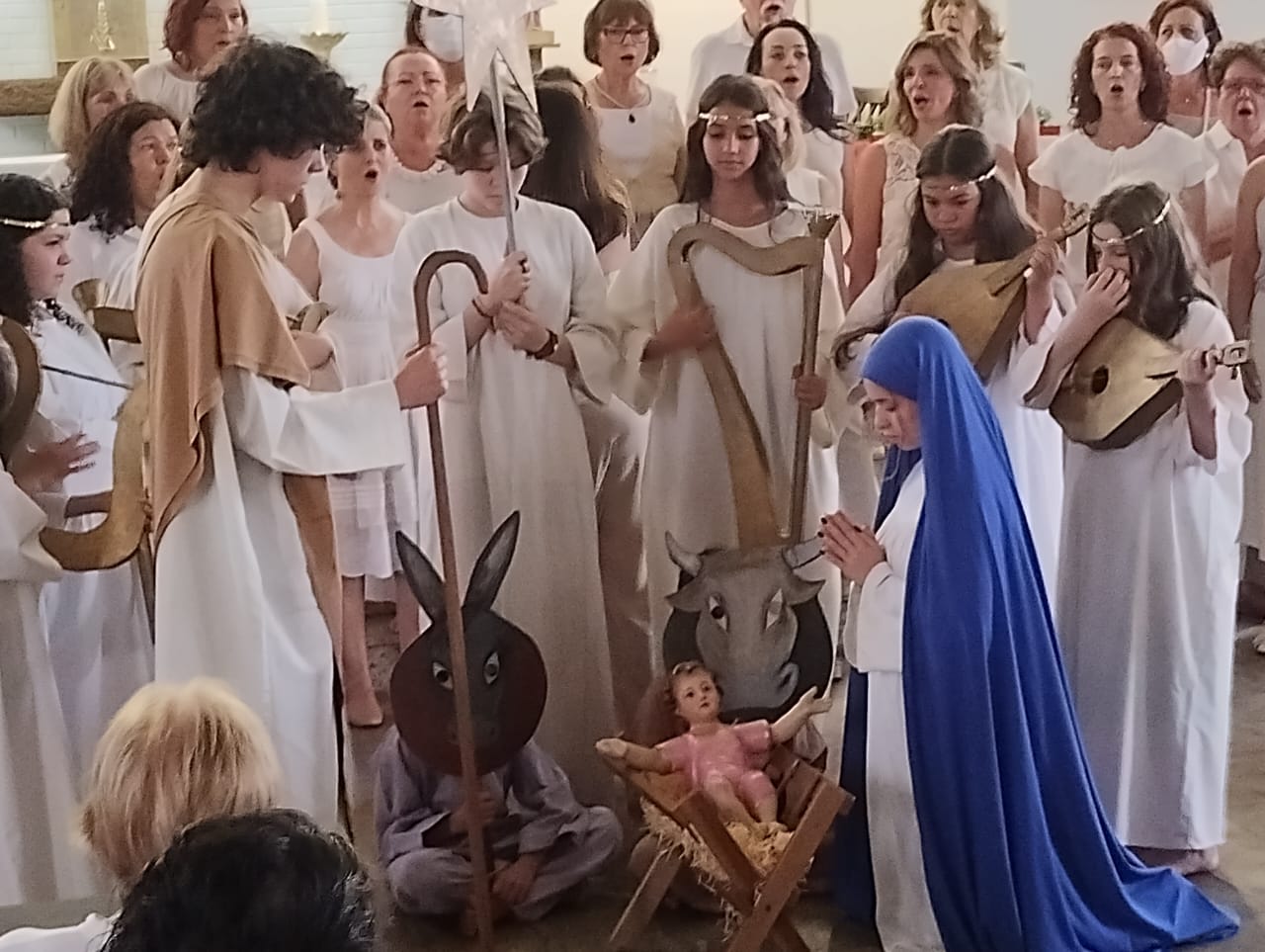 Enquanto o coro canta, os personagens do presépio (crianças e adolescentes) vão se colocando em cena até completar a imagem do presépio com a chegada dos Reis Magos. Vale a pena apreciar.