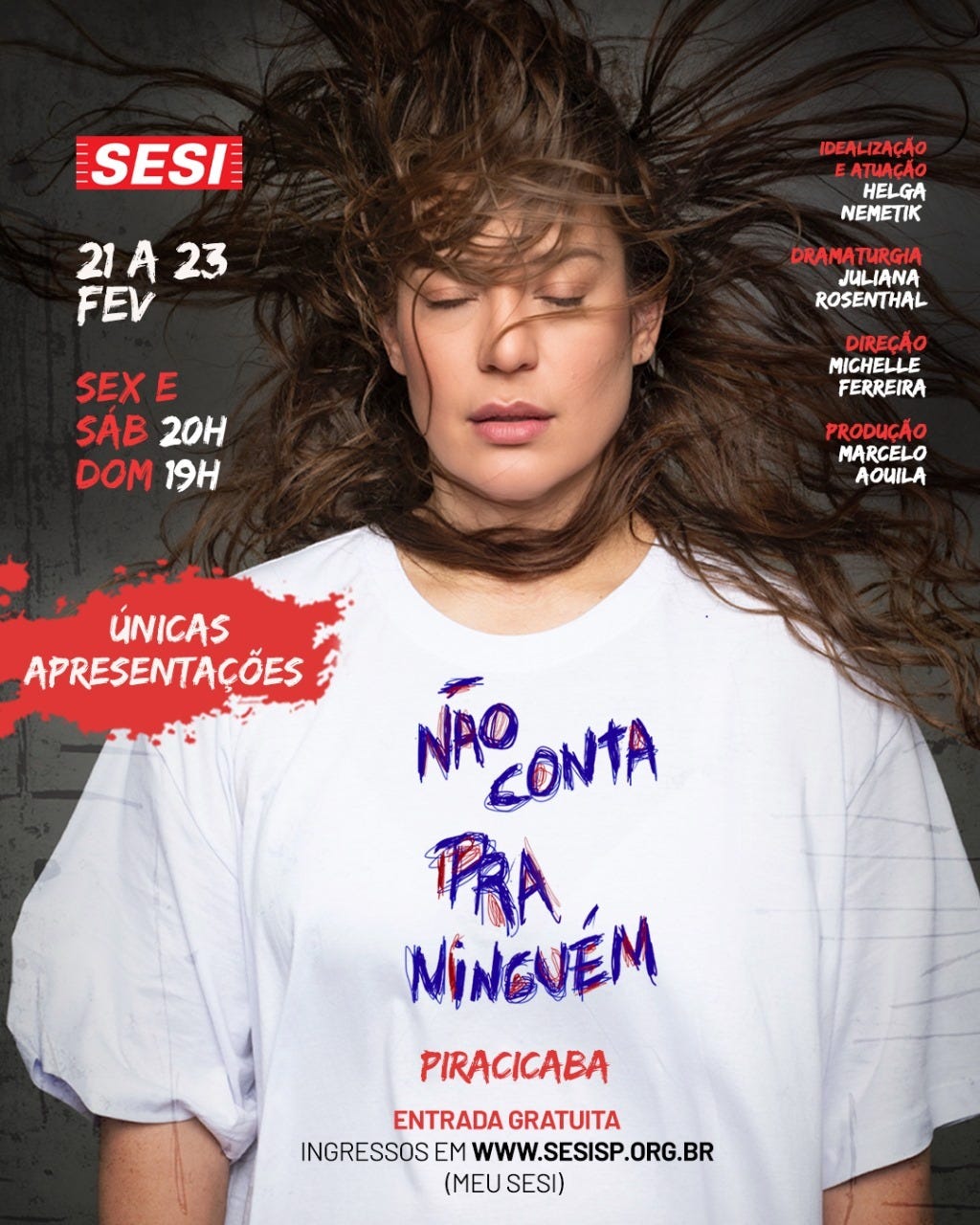 Após duas temporadas na capital paulista, com grande sucesso de público e crítica, o espetáculo “Não Conta Pra Ninguém”, idealizado e protagonizado pela atriz e cantora Helga Nemetik, que retrata um drama pessoal vivido por ela na infância, chega a Piracicaba em fevereiro com três sessões gratuitas no Sesi Piracicaba: nos dias 21/2 (sexta-feira) e 22/2 (sábado) às 20 horas, e dia 23/2 (domingo) às 19 horas. Os ingressos devem ser retirados com antecedência no site do SESI SP (www.sesisp.org.br), no canal Meu SESI.