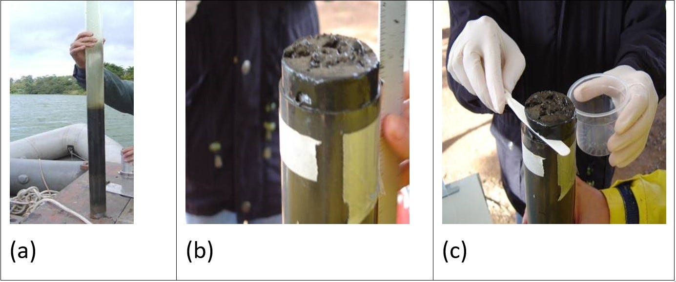 Os pesquisadores coletaram testemunhos de sedimentos com o auxílio de mergulhadores. Esses testemunhos são cilindros verticais de material depositado do fundo do lago. Como o carbono-14 não se presta à datação de amostras relativamente recentes, as camadas foram datadas por meio do chumbo-210. O princípio físico é o mesmo do carbono-14: o decaimento radioativo do isótopo. “O chumbo-210 tem uma meia-vida de aproximadamente 22,3 anos, então, por meio da atividade desse isótopo, conseguimos atribuir uma idade a cada camada de sedimentos, como se estivéssemos numerando as páginas de um livro”, explica Jesus.