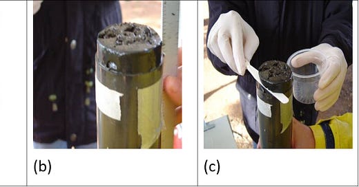 (a) Testemunho sedimentar; (b-c) Detalhe do fatiamento das amostras a cada 1 cm (fotos: Tatiane Araujo de Jesus)