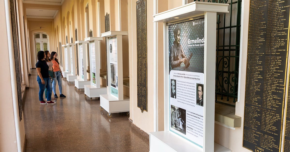 Desde o dia 21/3, no alpendre do Edifício Central da Escola Superior de Agricultura Luiz de Queiroz (Esalq) da USP, está aberta para visitação uma exposição que destaca os passos de Ermelinda Ottoni de Souza Queiroz, viúva de Luiz Vicente de Souza Queiroz (1848-1898), idealizador da instituição. Por ter sido uma mulher de caráter exemplar, de temperamento independente, pioneira de ideias e precursora do universo feminino, a atividade comemora seus 170 anos de nascimento e faz uma reverência pelo mês em que ela nasceu e em que se comemora o Dia Internacional da Mulher.