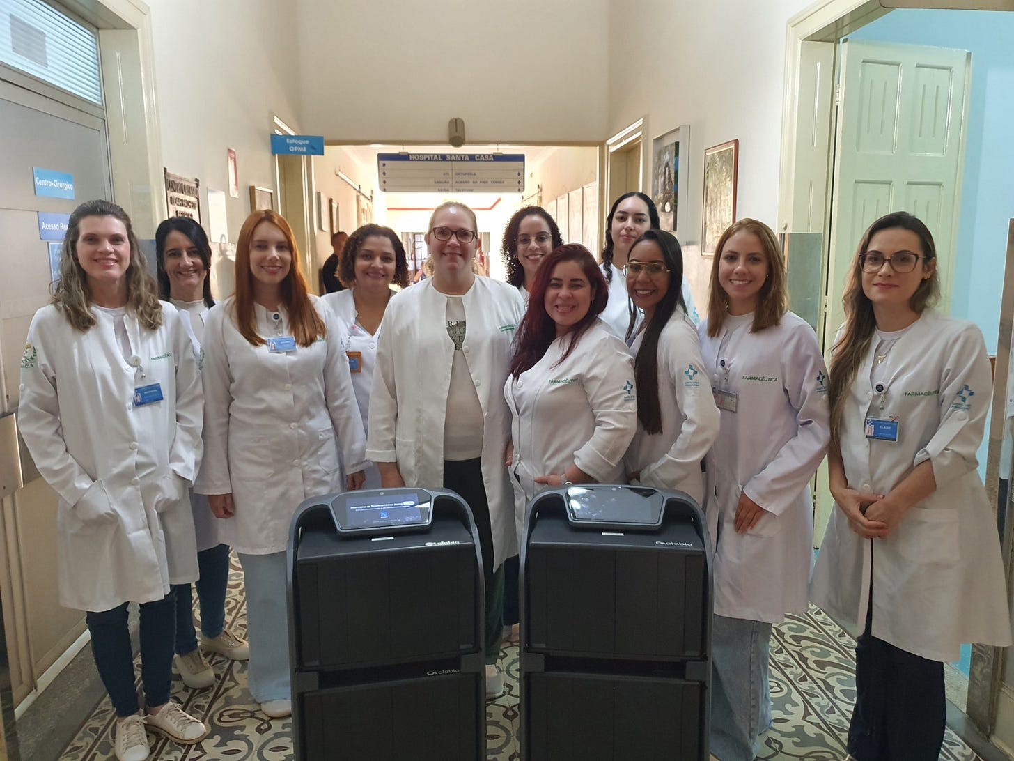 Equipe de farmacêuticas da Santa Casa de Piracicaba entre os dois robôs recém adquiridos