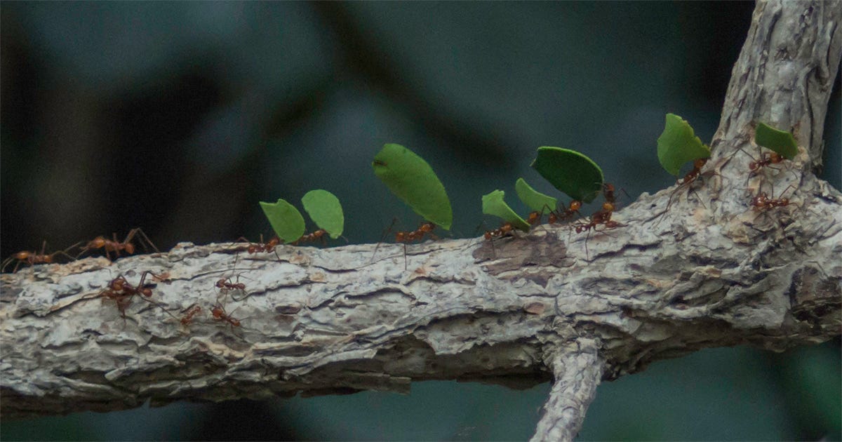 Todas as noites, as saúvas, ou formigas cortadeiras, saem à procura de folhas. Não as comem – levam direto para o formigueiro, onde cultivam um fungo. Esse sim é o banquete.