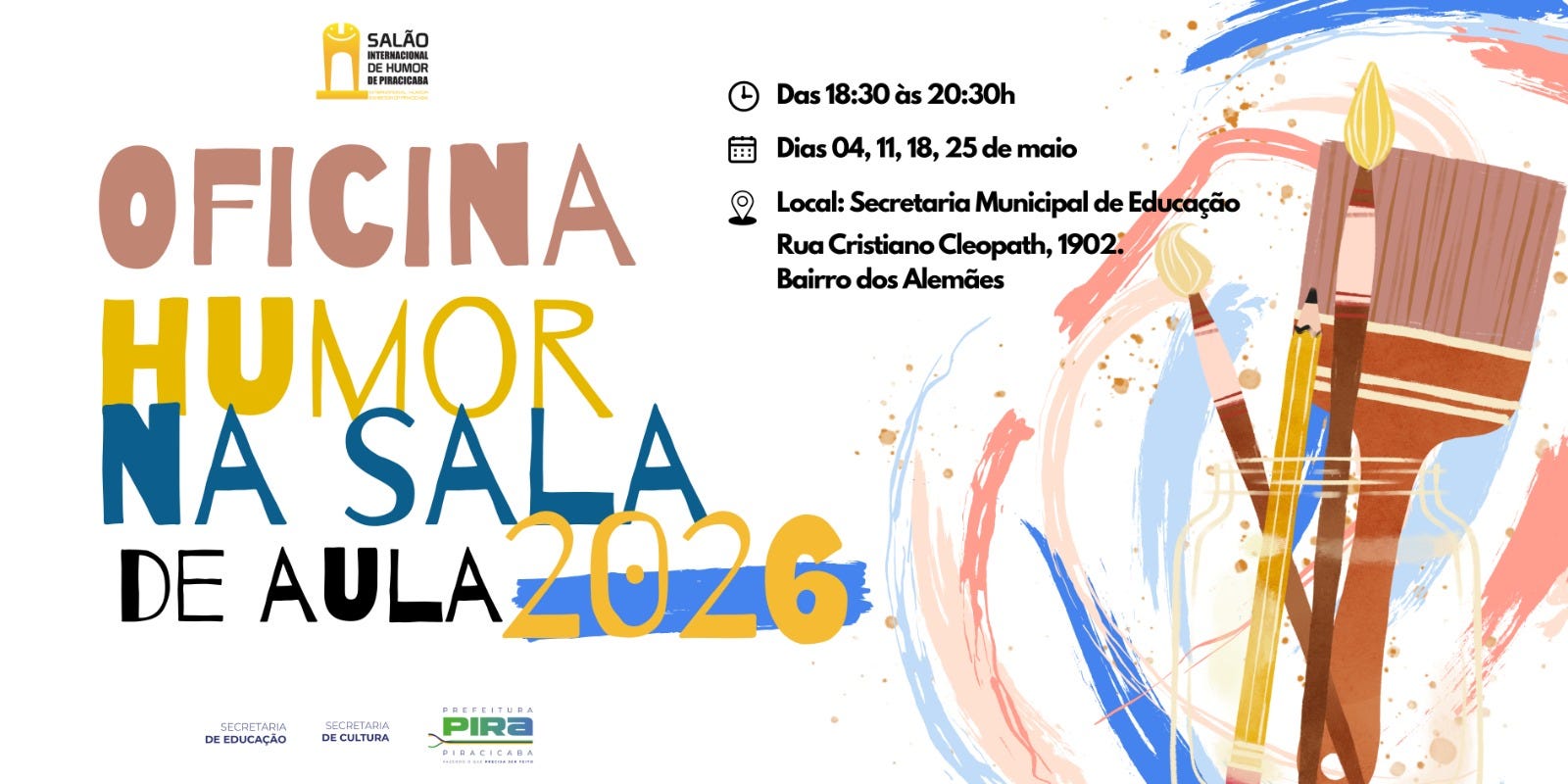 Vem aí a edição 2026 da Oficina Humor na Sala de Aula, voltada a professores da rede municipal, estadual e particular de Piracicaba. A oficina é uma parceria entre a Secretaria Municipal de Cultura, Salão de Humor e Secretaria Municipal de Educação.