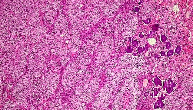 Germinoma, um tipo específico de TCG que ocorre mais frequentemente no cérebro: tumores raros, heterogêneos e difíceis de estudar (imagem: Departamento de Anatomia Patológica/FCM-Unicamp)