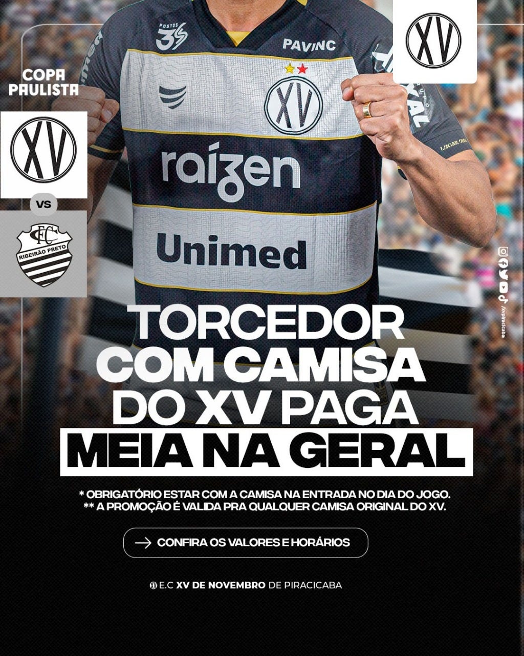 O XV de Piracicaba faz, diante do Comercial, no próximo sábado (27), às 18 horas, no Estádio Municipal Barão da Serra Negra, em Piracicaba, a segunda partida pelas semifinais da Copa Paulista Sicredi. Os ingressos já estão à venda, com promoção: torcedor com camisa do XV paga meia nos setores 5 e 6 (geral).