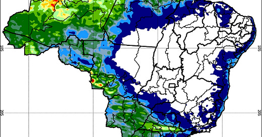 A previsão meteorológica para a semana de 26 de maio a 02 de junho indica chuvas volumosas no norte da Região Norte, sudoeste de Mato Grosso e sul do Rio Grande do Sul onde os volumes podem ultrapassar os 60 mm (tons em laranja e vermelho). Chuvas entre 20 e 40 mm poderão ocorrer em Mato Grosso do Sul, sudoeste de São Paulo e oeste da Região Sul.