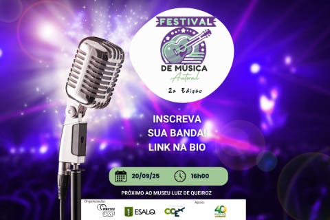 Estão abertas as inscrições para o II Festival de Música Autoral, organizado pela Escola Superior de Agricultura Luiz de Queiroz (Esalq-USP). O evento será realizado no dia 20 de setembro, no gramado próximo ao Museu “Luiz de Queiroz”. As inscrição de compositores, intérpretes, grupos ou bandas da Região Metropolitana de Piracicaba (RMP) podem ser feitas até o dia 25 de agosto: Inscrições aqui!