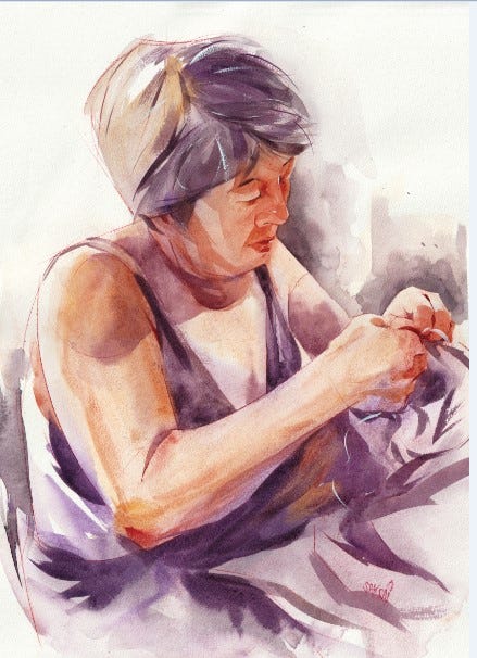 Obra acima: Mãe Costurando, do artista André Sakrai