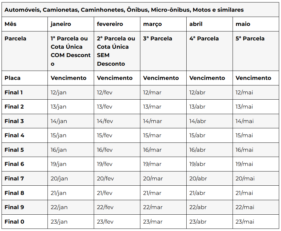 Confira as datas dos vencimentos de acordo com o final da placa do veículo: