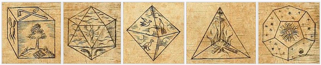 Referência aos sólidos platônicos na obra Mysterium Cosmographicum de Johannes Kepler. Referência: este artigo da Wikipedia pt-br.