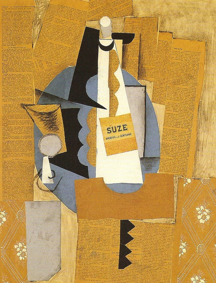 Pablo Picasso. Vidro e garrafa de Suze. 1912. Um tipo de imagem nunca visto antes.