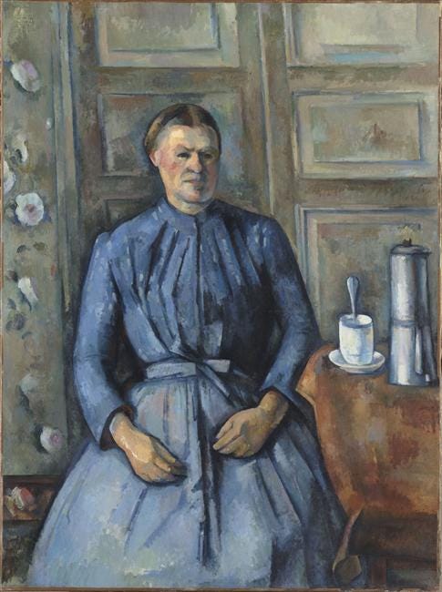 Cézanne, em retrato de sua esposa, 1890. O quadro: “Mulher com cafeteira”. A brincadeira entre alunos de artes visuais é: quem é a mulher, quem é a cafeteira?