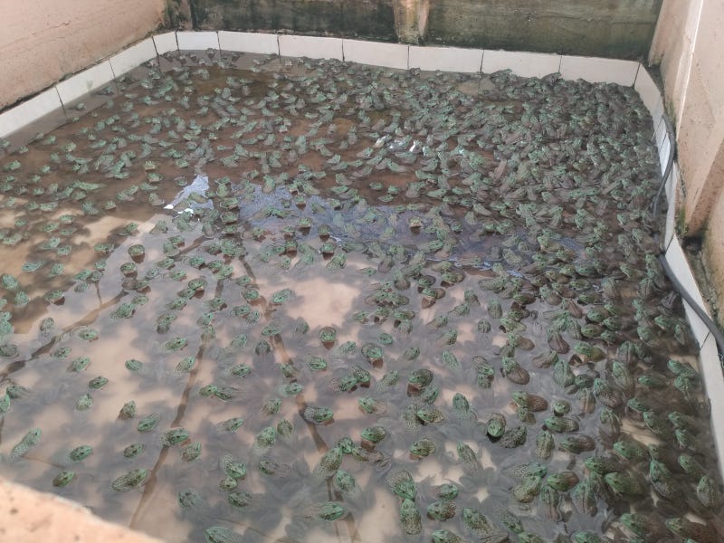 Ranário brasileiro dedicado à criação de rãs-touro (Aquarana catesbeiana). Uso de água do entorno sem tratamento e alta densidade de animais podem contribuir para infecção por fungo presente no ambiente (foto: Luisa Ribeiro)