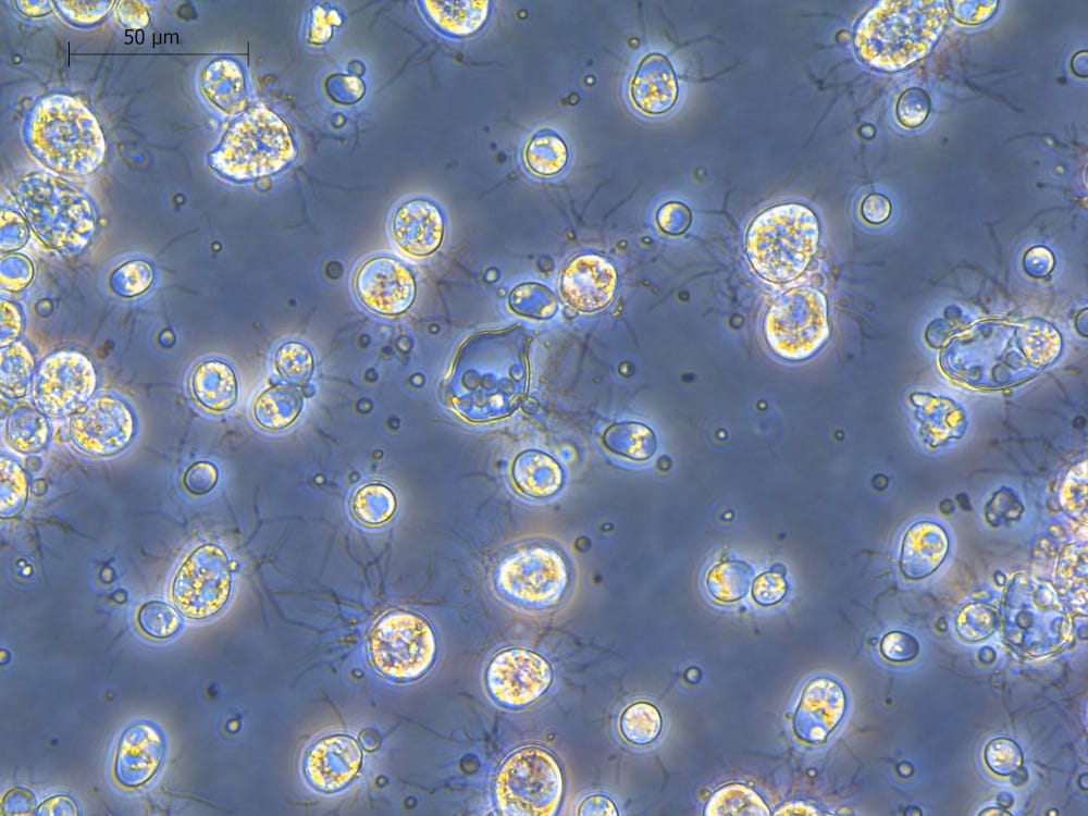 Microscopia do fungo quitrídio Batrachochytrium dendrobatidis (Bd), agente causador da quitridiomicose, mostra zoosporângios e zoósporos responsáveis pela infecção em anfíbios (foto: Mariana Pontes)