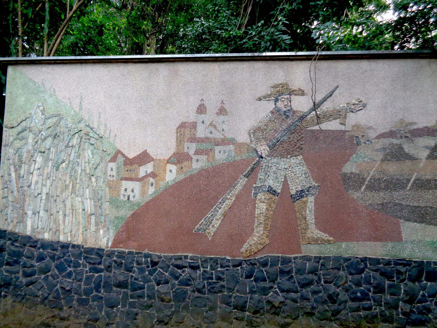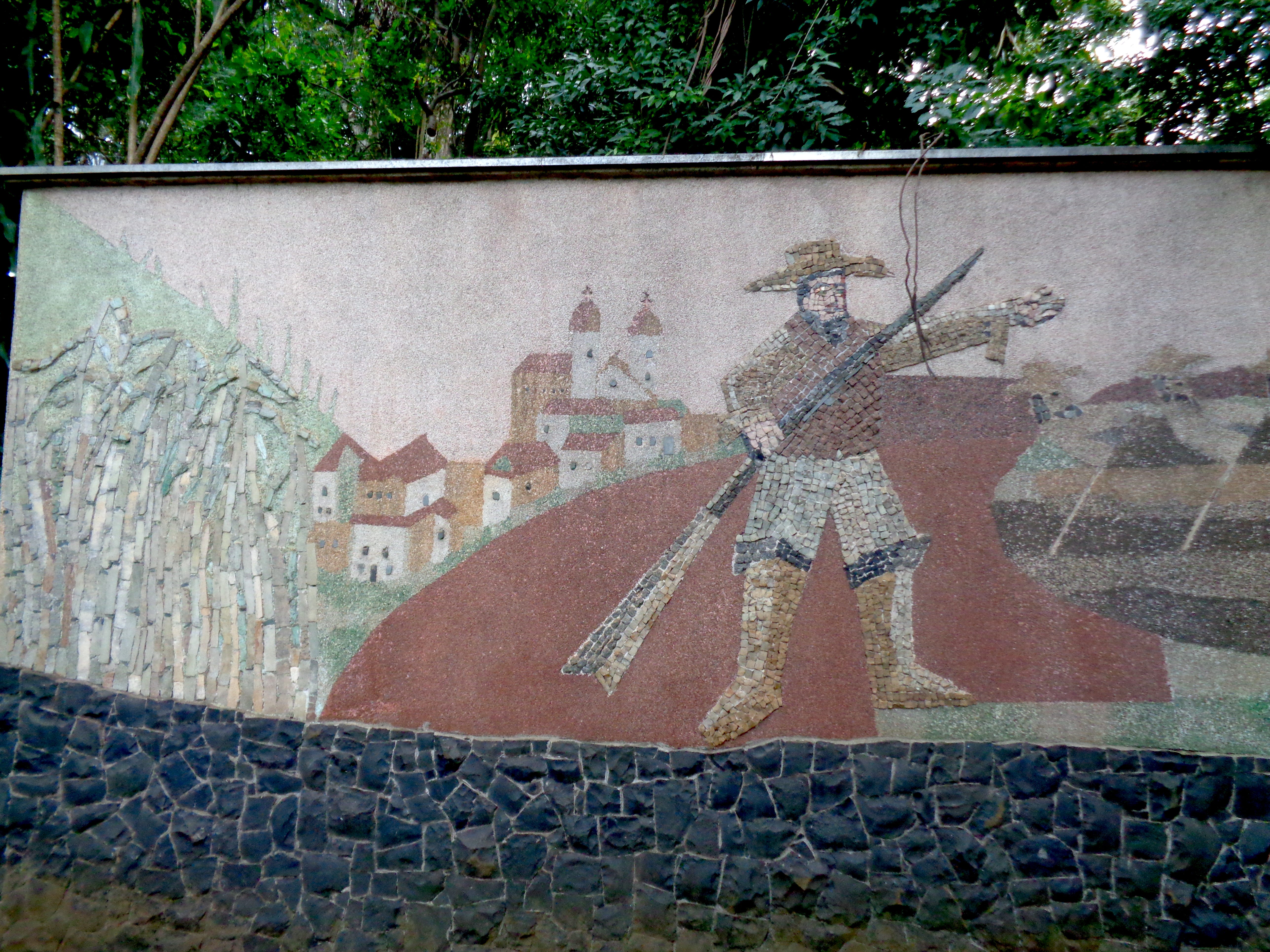 Parte esquerda do mural, foto de 2015, representando a Piracicaba do passado, com a figura do Bandeirante.