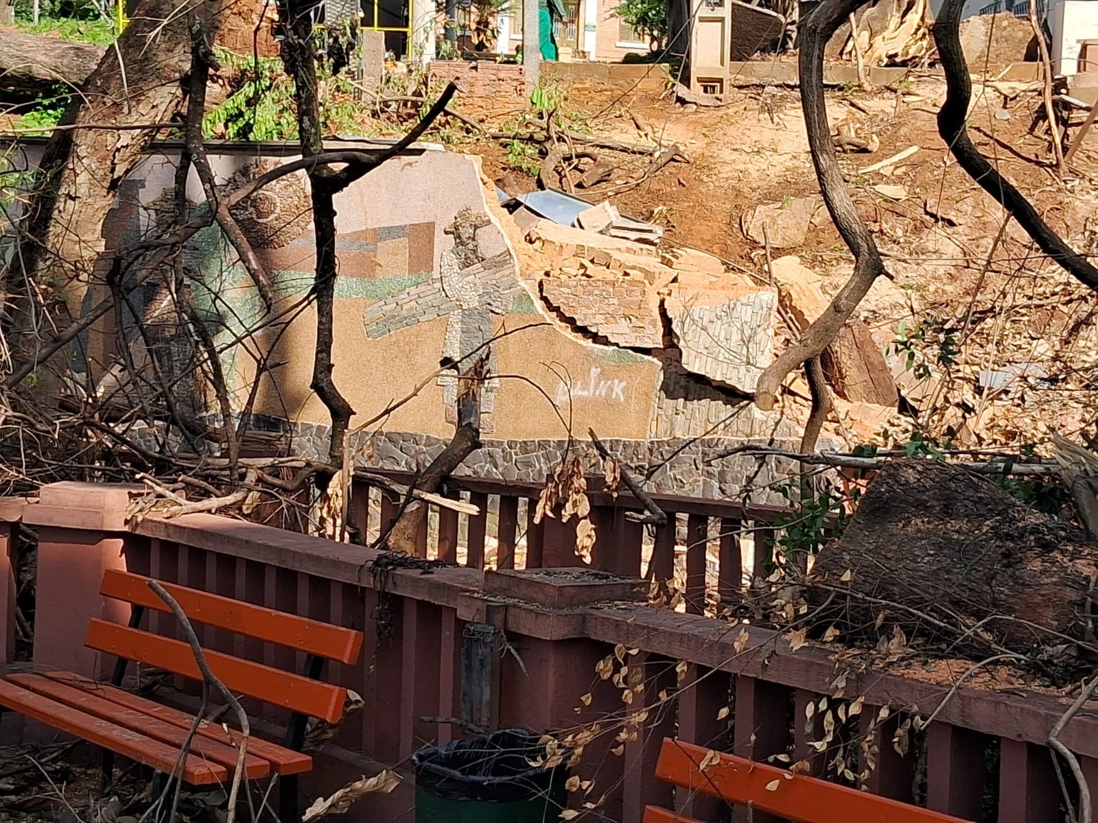 O que passou despercebido, no entanto, foi que uma das árvores caiu sobre o mural de mosaico representando a “Noiva da Colina” e outros elementos da história de Piracicaba. A obra é de autoria da artista plástica Clemência Pizzigatti, e foi instalada no local em 1978. A queda provocou a destruição de parte da parede, numa extensão aproximada dois metros de largura, na diagonal, como é possível ver na foto que abre este texto. A cobertura de mosaico neste trecho foi destruída, tendo várias peças de pedra sido esmigalhadas.